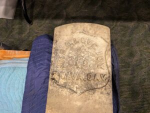 One of the museum’s most recent acquisitions is a headstone belonging to Pvt. James Lovejoy of the 7th West Virginia Cavalry. Lovejoy served with the regiment for nearly a year and a half (January 1864 to August 1865) and accompanied Maj. Gen. David Hunter’s raid on Lynchburg, Virginia from May 26 to July 1, 1864, and fought in the battle of Lynchburg on June 17 and 18. Lovejoy returned home to Lincoln County after the war and died on April 11, 1918. His federal-style tombstone was placed in the Lovejoy family cemetery after his death to commemorate his service in the Union army. Private Loveyjoy hailed from one of West Virginia’s most illustrious military families. His descendent, Vernon Lovejoy, served in the Vietnam War, and his kit bag is also displayed in the museum.
