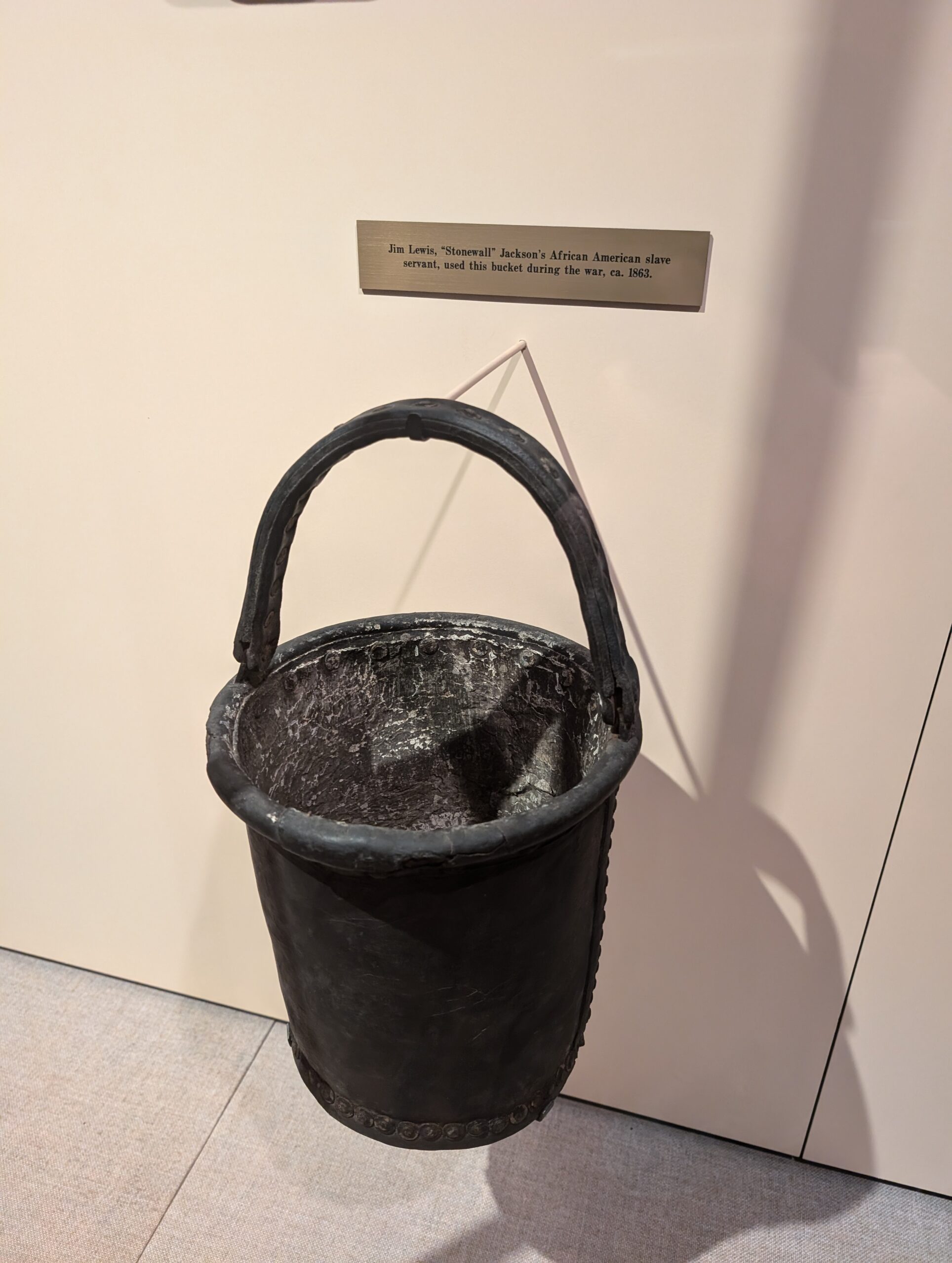 The state museum naturally has a large collection dedicated to Stonewall Jackson, since he was born in Clarksburg. However, one artifact that stood out to me belonged to Jackson’s slave, Jim Lewis. Little documentation about Lewis’s life exists, but it is likely that Jackson rented him from another slaveholder, W.C. Lewis from Lexington, Virginia. Lewis served the general throughout the war and was present for Jackson’s death at Guinea Station in May 1863. The museum holds a bucket used by Jim Lewis during the war, likely during his duties as Jackson’s personal domestic servant.