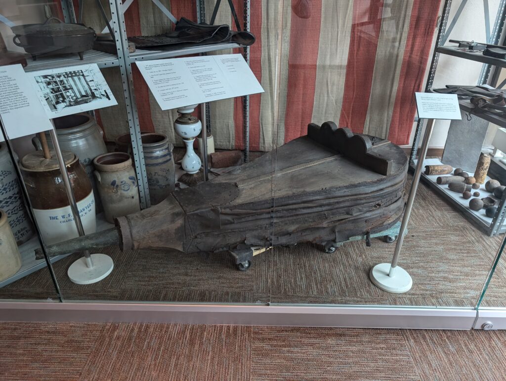 Located in a special display is a large blacksmith bellows from Preston County, West Virginia. Made in circa 1840, the bellows belonged to Guy Harvey and resided on his farm in the town of Eglon. During the Civil War, both Union and Confederates passed by the farm to shod their horses. Harvey’s daughters wrote extensively of their treatment by the soldiers and how Confederate troops felled trees on the property to slow down their pursuit by the Union army.