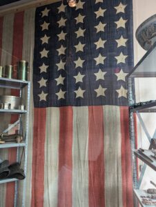 Located just behind the bellows is an American flag, allegedly flown over the Soldiers’ National Cemetery during Abraham Lincoln’s Gettysburg Address. The banner was hand-stitched shortly after West Virginia became a state in June 1863, and notes West Virginia’s statehood by including 35 stars. Much like John Brown’s noose, several individuals and institutions claim to have the Gettysburg Address flag. However, the New York Times noted that “numerous flags and banners, suitably draped, were exhibited” during the dedication ceremony, so it is perhaps likely that this flag flew over the cemetery on November 19, 1863 as Lincoln uttered his immortal words.