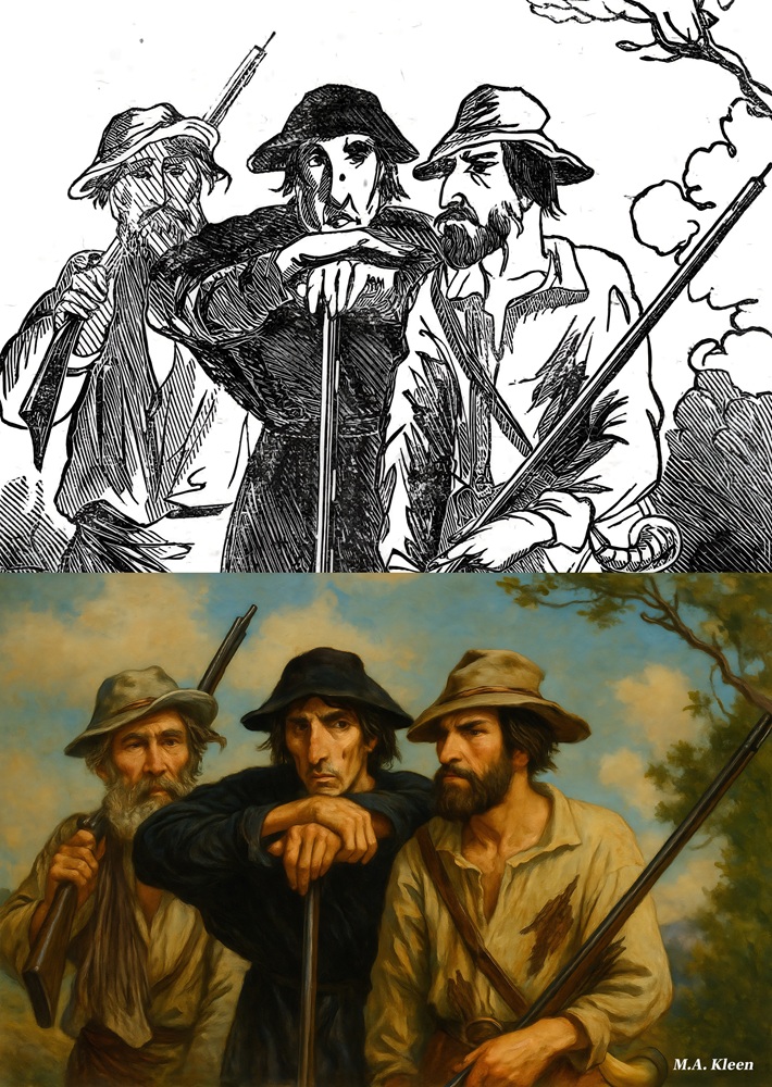 Doing so, however, erases the illustrator’s original intent, which was likely a satirical caricature. The men appear more heroic and determined, and their exaggerated features are toned down. Viewers unfamiliar with the original artwork may interpret the enhanced image as a literal, historically accurate scene, which it is not.