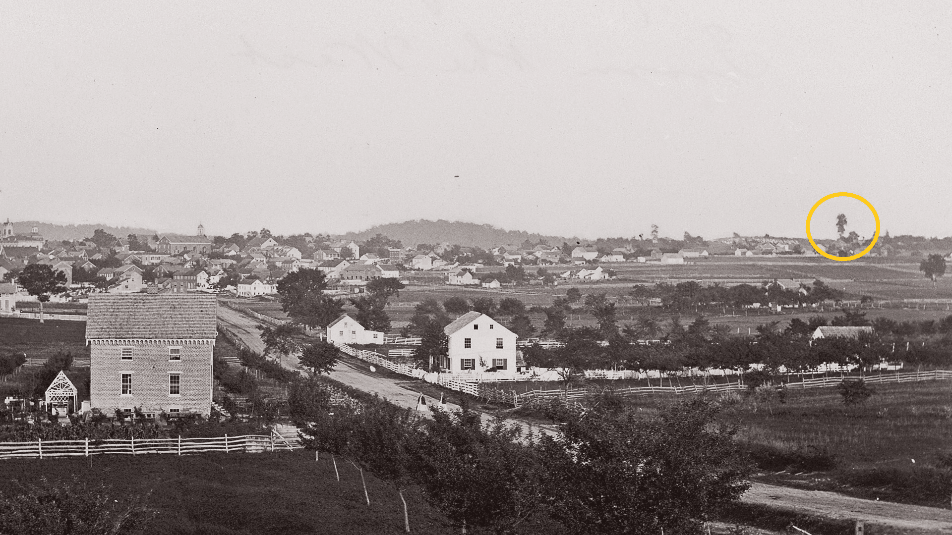 Frassanito skillfully compared the background of the photograph with others taken by Mathew Brady on July 15, 1863. Key to his analysis was the “mammoth tree” that once towered over Cemetery Hill.[1] This tree is unmistakably visible over the right shoulder of the left Confederate prisoner. It is also visible in Brady’s view of the town of Gettysburg captured on the same day just a few yards to the north of where the prisoners stood. The site of the photograph makes sense because Brady undoubtedly took at least two other photographs on Seminary Ridge that day (the aforementioned one of the town and one of Lee’s headquarters), as well as a handful of photographs on nearby McPherson Ridge.
