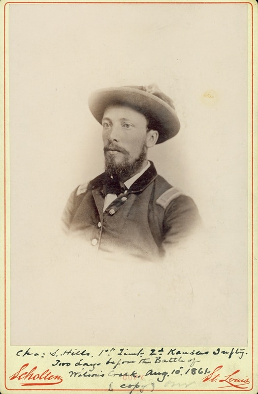 The grim cost of war would soon arrive. Within two months of their departure, the Emporia Guards and the rest of the 2nd Kansas were at the bloody Battle of Wilson’s Creek. Stotler rushed to deliver news of the battle and the role of the Emporia men. He enthusiastically printed an unsentimental letter from a local resident, Lt. Charles S. Hills, one of the officers of the company wounded in the battle. It vividly described the horrors of the battlefield and the suffering of the Emporia men. “It was a sickening sight to see the poor fellows calling for water, as they lay on the field, trampled under foot,” he recounted, “and the fearful carnage adding scores to their number each minute!”[9]