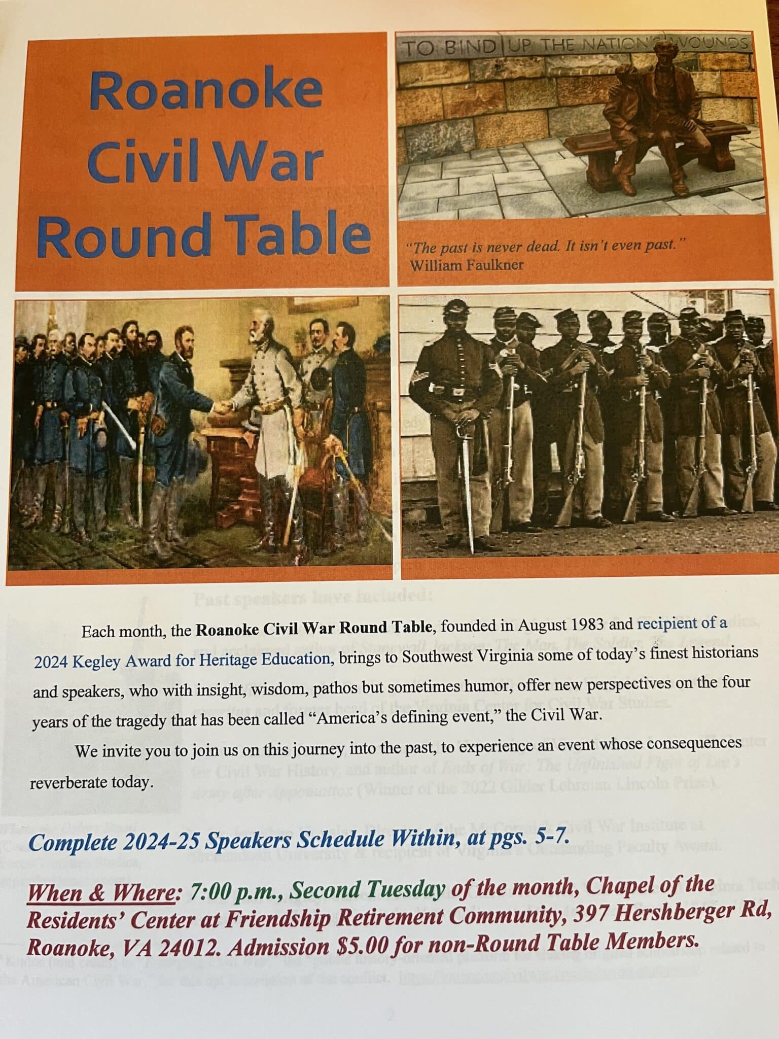 How was this turnaround accomplished? By doing what Round Tables do best—shining a light on our Civil War past, in this case by turning a spotlight on our own Civil War educational mission. Not being flush with greenbacks, we created a colorful brochure off a laptop, highlighting our purpose and our wonderful line up of great speakers, along with a gallery of past topics covered, all showing the breath of our offerings (“it’s not just battles”). Keith Rocco, the celebrated Civil War artist, graciously gave us permission to illustrate our brochure with some of his artwork. An accompanying single page flyer was adopted to identify the immediate upcoming speakers.