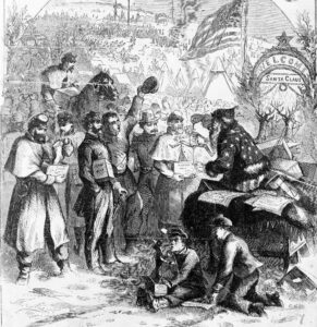 This month’s header image comes to us courtesy of Thomas Nast, whose illustration for Harper’s Weekly depicts a visit from Santa Claus to a Union army camp. Published as the cover on January 3, 1863, Nast’s Santa gives out much-needed supplies like new socks (and copies of Harper’s Weekly), as well as a dancing puppet of Jefferson Davis. This Christmas illustration is the first of 33 that Nast would create for the magazine over 23 years.