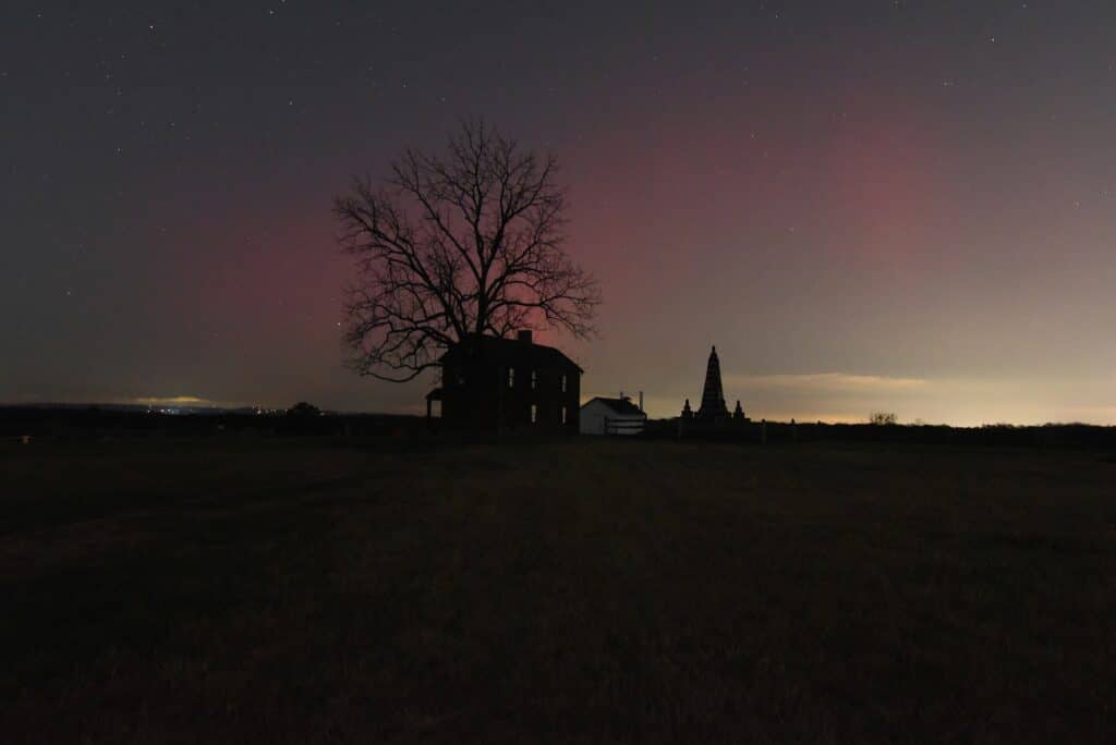 With the promise of Northern Lights sightings in Northern Virginia on November 12, I hauled my cameras and tripod to the Manassas National Battlefield Park and waited for their arrival. They took their time. When they finally unfurled, a faint pink ribbon swept over the horizon and hung in the sky behind the Henry House on Henry Hill, where I framed my shot. I felt the landscape shift. It was exhilarating, but also affecting. The quiet ground beneath my feet once shook with musket fire and cannon blasts, yet here it was illuminated by the same celestial wonder that soldiers witnessed on another battlefield more than 160 years ago.