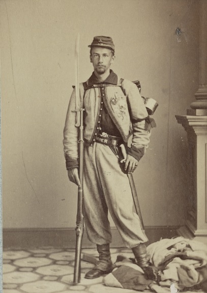 Colonel Elmer Ellsworth’s avenger was Troy-born Private Francis Edwin Brownell, a member of New York City’s Hose Company 42. During the ill-fated flag capture at the Marshall House, Brownell led the descent down the staircase. Initially, Innkeeper James W. Jackson took aim at Brownell, firing with his first barrel, but missed when his shotgun caught on the banister. In turn, Brownell raised his weapon to parry Jackson’s shotgun, but it, too, caught on the railing, allowing Jackson to fire his second barrel at Ellsworth. Brownell promptly returned fire and then lunged with his bayonet, sending Jackson’s body tumbling down the stairs. In the aftermath of the incident, Brownell became famous. In recognition for his service, the U.S. Army offered him a commission in the 11th U.S. Infantry. This publicity shot taken after Ellsworth’s death depicts Brownell in his Fire Zouave uniform. His belt, which reads, “Premier,” honors his fire company from Troy, Premier 1. In 1877, he received the Medal of Honor for killing Jackson.