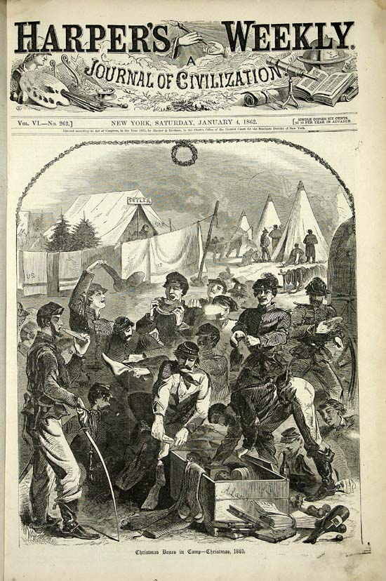The same week Nast’s Christmas tree image appeared, the front cover of Harper’s Weekly featured a woodcut from a Winslow Homer drawing, “Christmas Boxes in Camp.”
