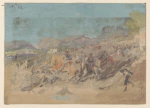 “Two sections of the 13th N. Y. Battery (Dutch) . . . were captured by the enemy but were retaken. At one time they came so close to his battery that he (Lt. Bundy) gathered up a lot of musket balls laying near his pieces, charged his guns with them, and discharged them into the Rebel Ranks—It was a beautiful sight (if the word will apply to such scenes)—the country was open and hilly, and from a hill close by, a fine view was had of the whole affair. The rebels, looking more like a mob than a body of soldiers in their shirt sleeves (they wear white cotton shirts) sleeves rolled up, with nothing but a canteen strung over their shoulders, carrying their pieces at Right Shoulder Shift, as if they were going out to drill rather than fight. [They were] ‘rushing madly,’ waving their battle flags, which being shot down four or five times, were gathered up as quickly, and moved as lustily as before. Their imagined or apparent success was of short duration.”[2]