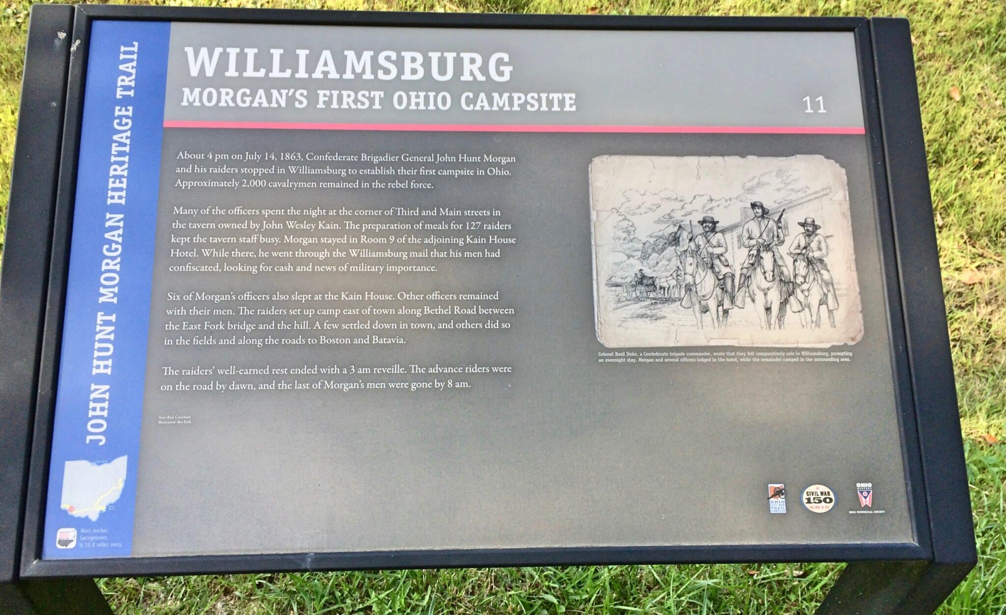 Williamsburg was the largest settlement in Clermont County. Here, the raiders got their first full nights’ rest since leaving Tennessee. They had gone from Sunmansville, Indiana to Williamsburg, a 95-mile ride in just over 35 hours. In Williamsburg, General Morgan set up his headquarters and called on the local townspeople to supply his army with food. One of the town’s residents was John Lytle, the brother of Union General William Lytle. Morgan, seeing an opportunity, carved in Lytle’s doorstep: “John Morgan, July 14, 1863, 3,000 men.” Perhaps it was boasting on Morgan’s part, however, since at no time during the raid, did he have 3,000 men with him. By the time he reached Williamsburg, his men numbered around 1,900.