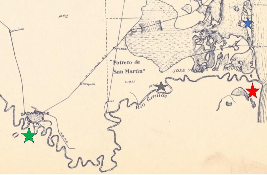 Map of the region in question, stars added by author. The stars correspond to: Matamoros (Green), Bagdad (Red), Palmito Ranch (Gray), and Brazos Island (Blue). Star size is not meant to indicate scale. University of Texas Arlington Library, https://texashistory.unt.edu/ark:/67531/metapth231916/m1/1/
