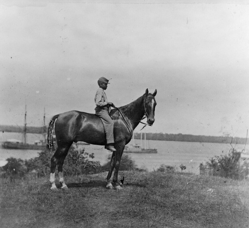 This photograph at the Library of Congress shows an African American boy on John Rawlins’ horse, most likely at City Point in 1864. The tail looks suspiciously touched up or drawn on.