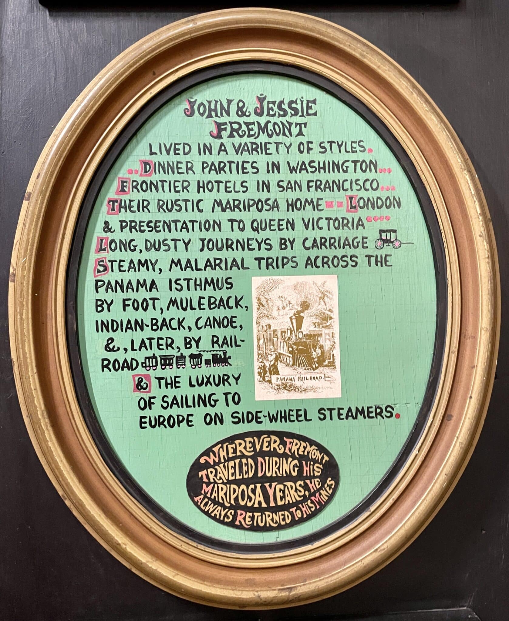 This sign in the Mariposa Museum and History Center describes the “variety of styles” in which John and Jessie Frémont lived over their 49 years of marriage. Photo by Tonya McQuade.