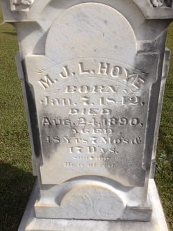 MJL Hoye (January 7, 1842 – April 24, 1890) was born in Monroe County, Georgia.[2] In 1856 his family moved to Newton County, Mississippi. The 1860 census gave the then 18-year-old Hoye’s occupation as “Student.”[3]
