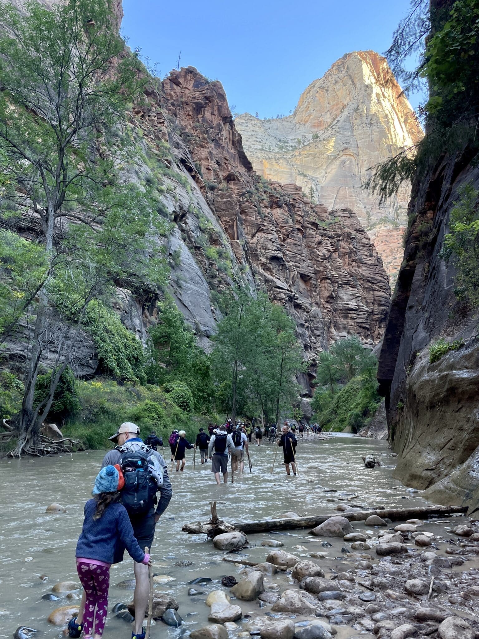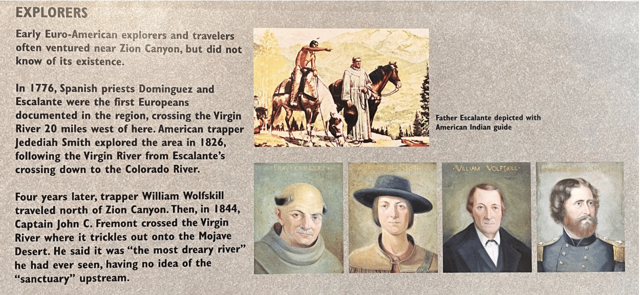 One place Frémont missed on his 1843-44 expedition was Zion National Park in southwestern Utah. He came close in1844, when he crossed the Virgin River where it trickles out onto the Mojave Desert. According to this display sign above, Frémont said it was “the most dreary river” he had ever seen, having no idea of the “sanctuary” upstream. While we chose not to hike the popular “Narrows” in Zion, where people walk through the Virgin River between towering sandstone cliffs, we did enjoy our hike on the Riverside Walk – and it was certainly not “dreary.” The scenery in Zion is gorgeous, and we watched as people set off through The Narrows.