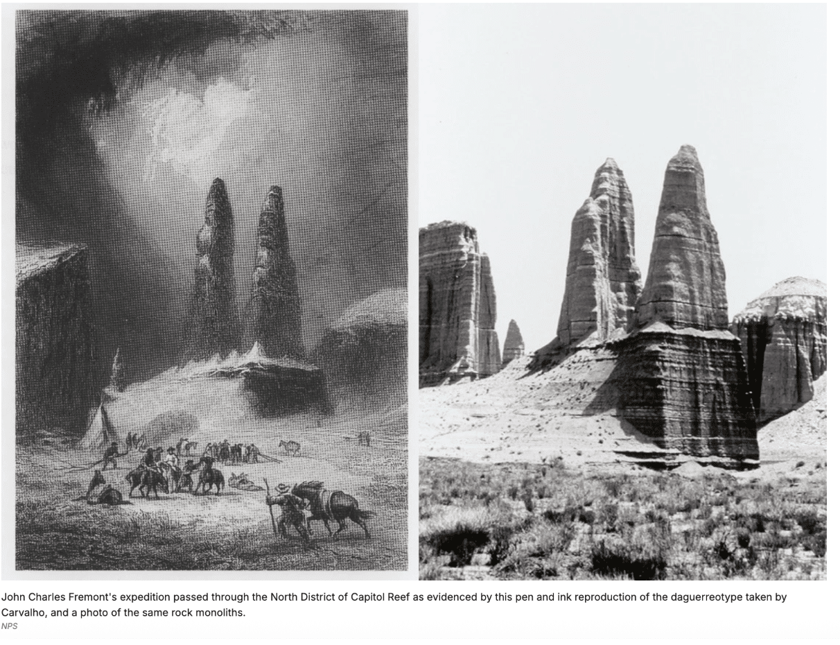 Frémont also missed out on seeing the areas in southern Utah that now make up Bryce Canyon, Canyonlands, and Arches National Parks – definitely his loss. He and his expeditionary group did, however, pass through what is now Capitol Reef National Park during the winter of 1853 while attempting to find a northern railroad route to the Pacific Ocean, as evidenced by the images below.
