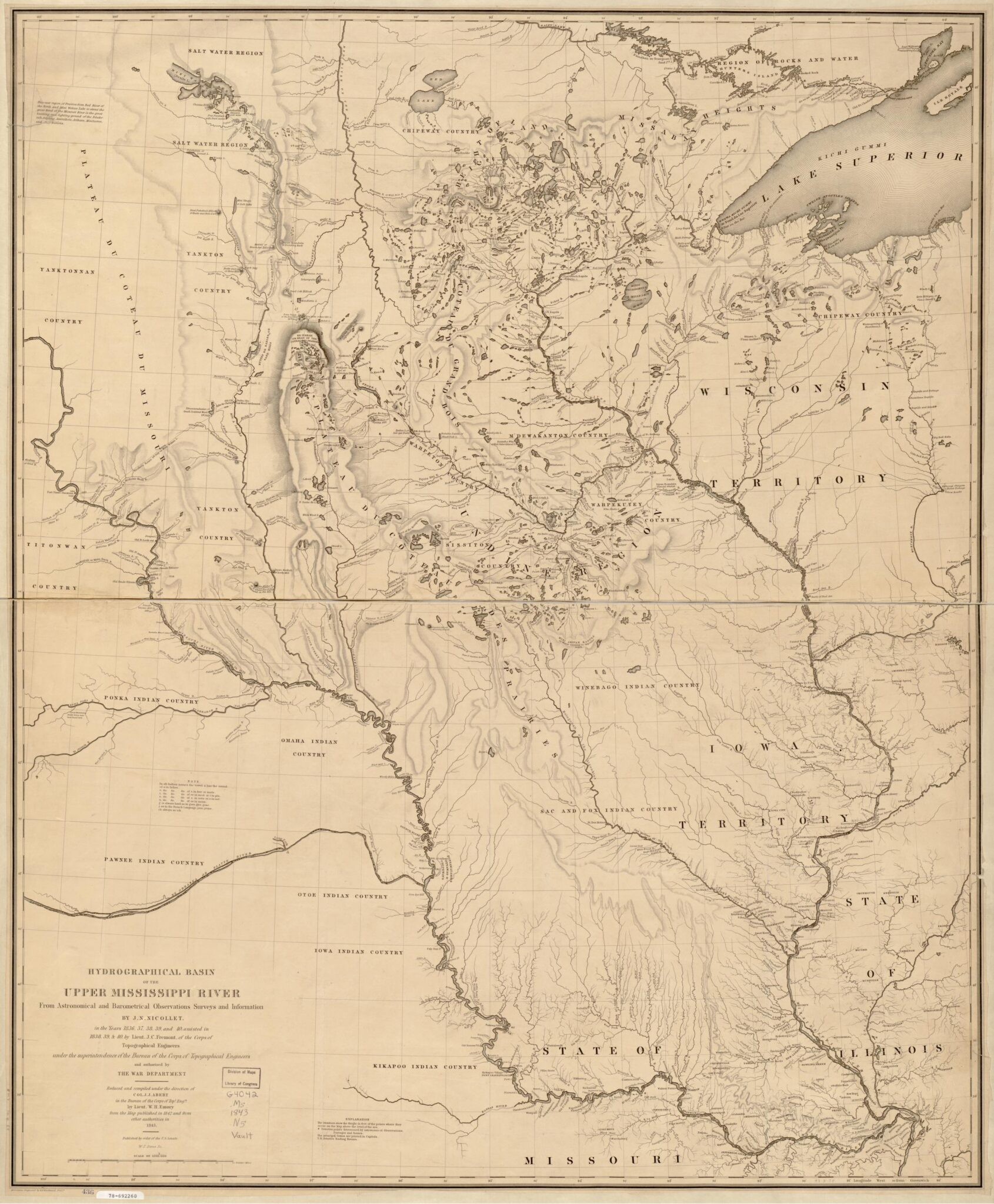 - Nicollet, Joseph Nicolas; Frémont, John Charles; and Stone, William James. “Hydrographical basin of the upper Mississippi River from astronomical and barometrical observations, surveys, and information.” Published by order of the U.S. Senate, Washington, 1843. Library of Congress, https://www.loc.gov/item/78692260/.