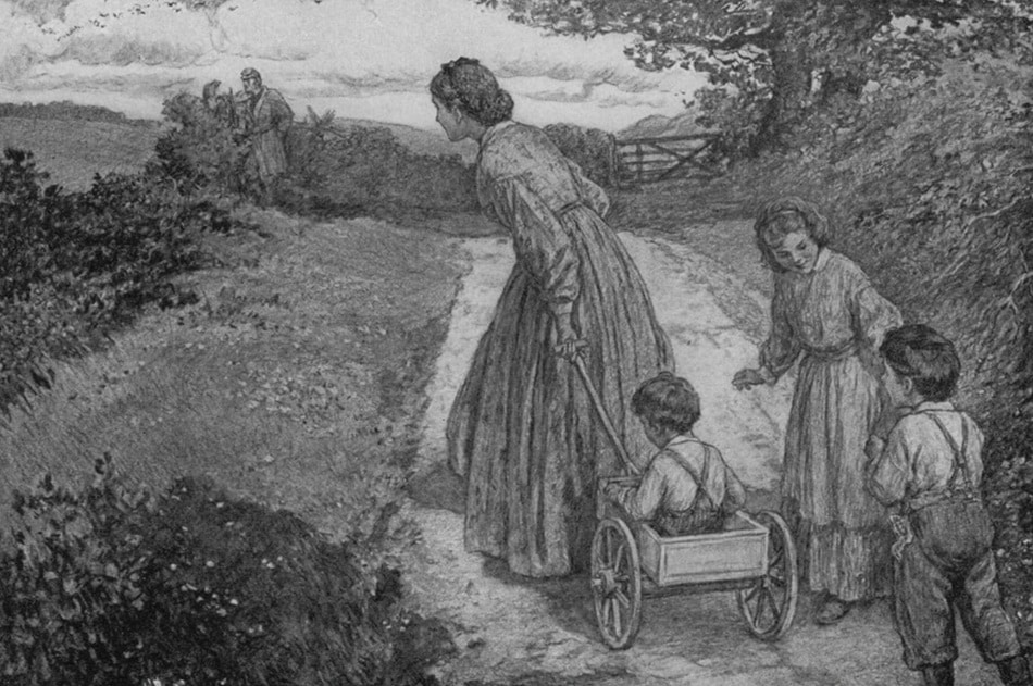 The tension in both the autobiographical and the fictional version of the story is the disappointing reception the private receives at home; his wife and daughter rush into his arms, but his sons—a five-year-old and a toddler born about the time he had left for the army—hold back. The bone-tired soldier is nearly heartbroken, but eventually he lures the boys to him with kind words and an apple. The family, reunited, go into their rather run-down house to listen to war stories and dare to dream of better days ahead.