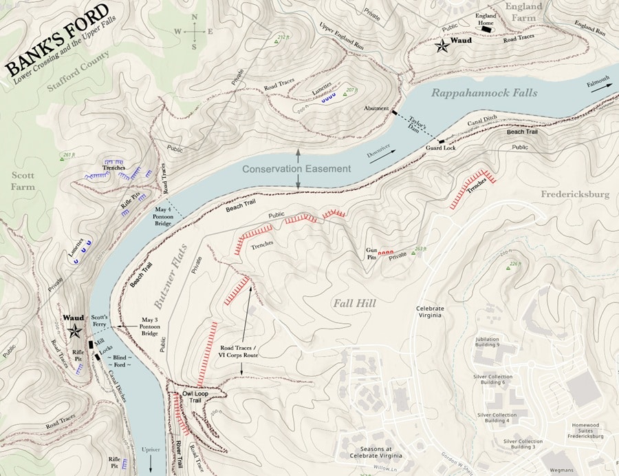 These historic sites and vistas might someday be more accessible, without the need for crossing the river. Stafford County has acknowledged that places along the easement “could be used for hiking trails” and has suggested the possibility of a Rappahannock Scenic River Trail connecting to “existing pedestrian trails in the Celebrate Virginia North development” and a “Cannon Ridge Trail” around Banks’ Ford.[7]
