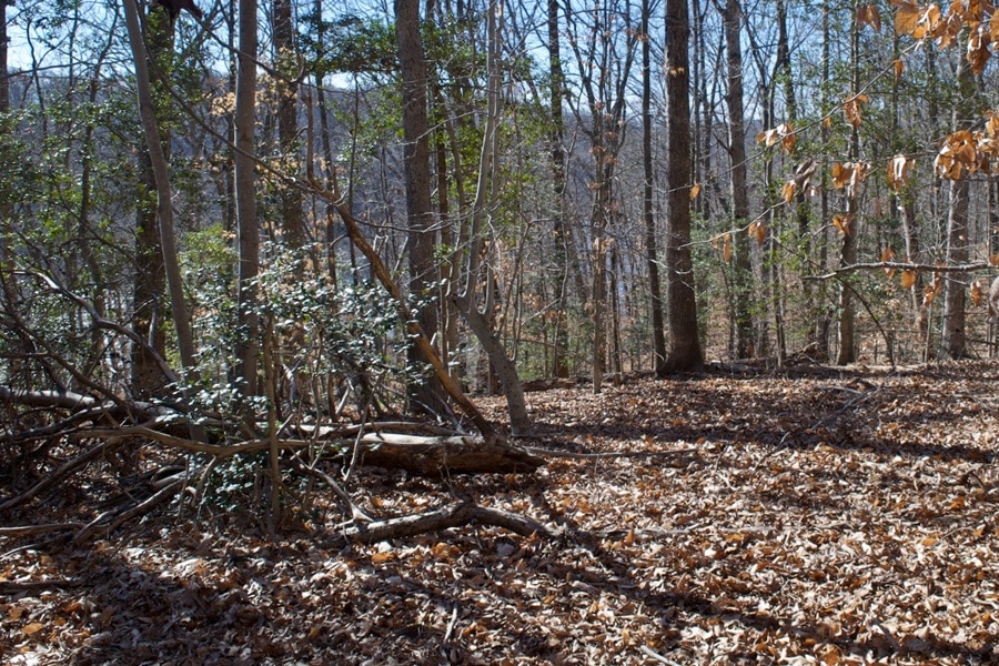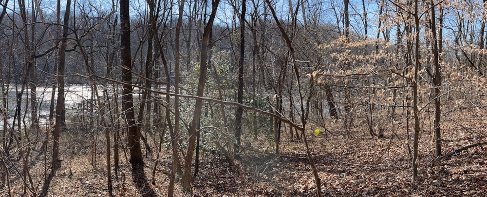 While trees again block the view, the distant hilltops best align with Waud’s sketch in this immediate vicinity. The two cannons were somewhere near that fallen tree on the left, and the patch of rocks and white water barely visible above it matches what Waud drew.