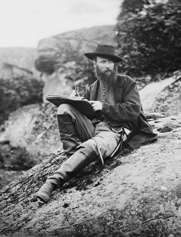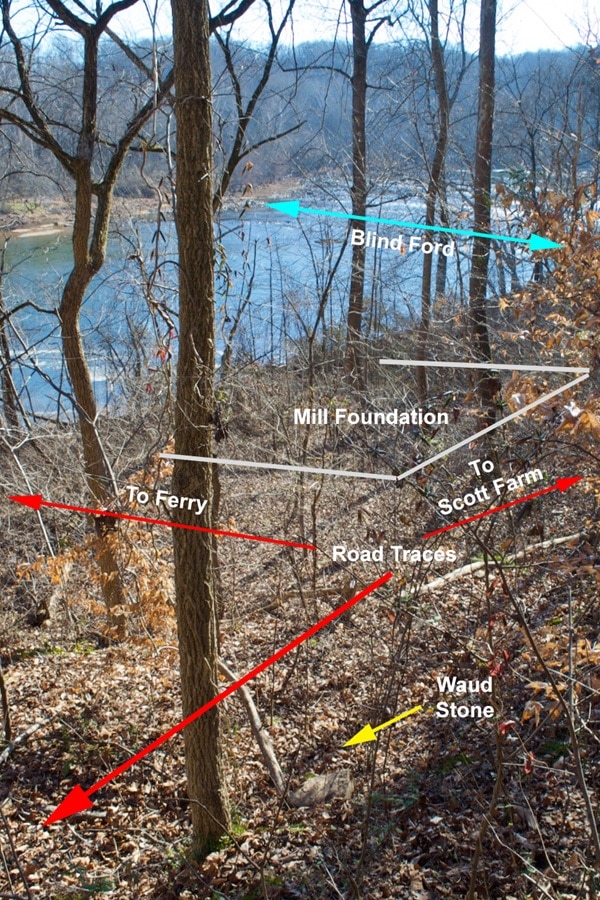 Left of the rocks in Waud’s sketch is the “blind ford”[6] where the river is narrower, shallower, and easier to cross than around Banks’ Dam, especially along the ford’s northern edge just before the sandier, deeper portion of the river where the ferry service ran. An antebellum road trace still wraps around the west and north side of the mill’s surviving foundation, ending at the river where the ferry began. It was on this road, just above where it bends toward the river, that Waud did his sketch. At the exact spot where the view today most aligns with the reference points in the sketch, there is a small, flat-topped boulder where he must have sat: