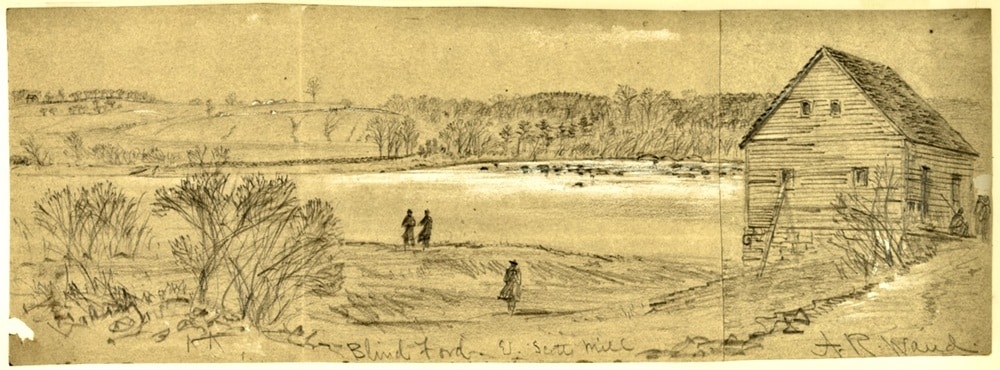 Ahead and across a stream, the modern trail follows an old antebellum road that once led to a “blind ford” connecting to Stafford County. Sometimes known as Scott’s Ford, this in fact is the Banks’ Ford repeatedly referred to in official reports and communications during the war, not the upper crossing near the dam. In early 1863, Waud sketched this view from a spot near Scott’s Mill:[4]