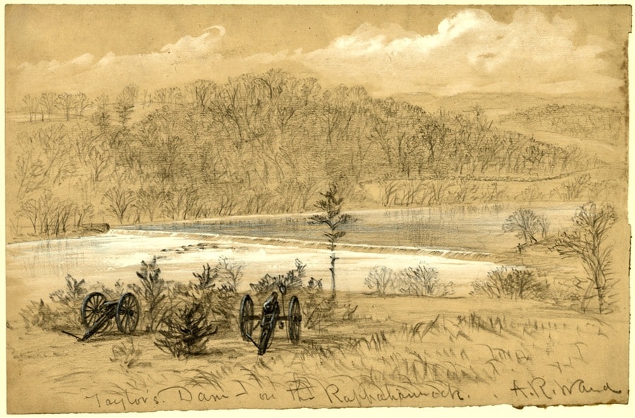 During his time covering the Civil War for Harper’s Weekly, Alfred R. Waud sketched several scenes from the north side of the Rappahannock River near Banks’ Ford. Today, the spots where he sat to do those sketches can all be found on a conservation easement “allowing for low-impact recreational use”[1] but walled off by miles of private property in Stafford County, making the river the only way most of the public can currently access it. This is possible to do on foot at several points, if not easy or advisable for everyone, and only when the river hasn’t risen. Kayaking from the Motts Run Boat Launch in Spotsylvania County is also an option.