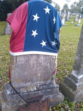 His grave stood out because, amid the drab-gray and dirty-white granite and marble grave markers, his wore a bright splash of color. Someone had draped the first national flag of the Confederacy over Norris’s gravestone—actually obscuring his name—and fastened it there with bungee chords. A bungee chord holds it to the C.S.A. Maltese cross in front of his grave, too.