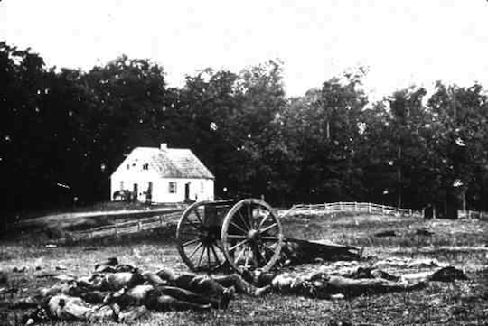 As the morning fight see-sawed back and forth through the Cornfield, it eventually swept forward to the very dooryard of the Dunker Church—an unadorned, whitewashed building that sits atop a small knoll along the Hagerstown Pike. Pacifists, the Dunkers suddenly found the war literally at their doorstep.
