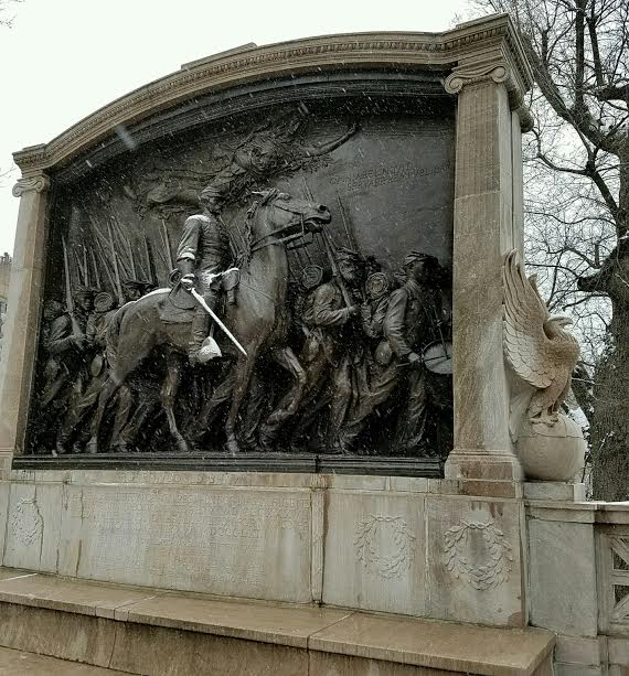 Last month, my wife traveled to Boston on a business trip. She worked a day into her schedule to go sight seeing with one of her colleagues. I asked her, if it was conducive to her schedule, to get a picture of Augustus Saint-Gaudens’ monument to Robert Gould Shaw and the 54th Massachusetts Infantry on Boston Common. Low and behold late that Friday morning she sent me the picture you see to the left. Saint-Gaudens completed sculptures of President Abraham Lincoln, Admiral David Farragut and Maj. Gen. William T. Sherman. His monument of Shaw and his regiment, the first all black unit raised in the North, marching to war is his finest. He used a number of models before deciding to use the 21 that are individually depicted. It was dedicated on May 31, 1897 and stands across on Beacon Street from the State House.