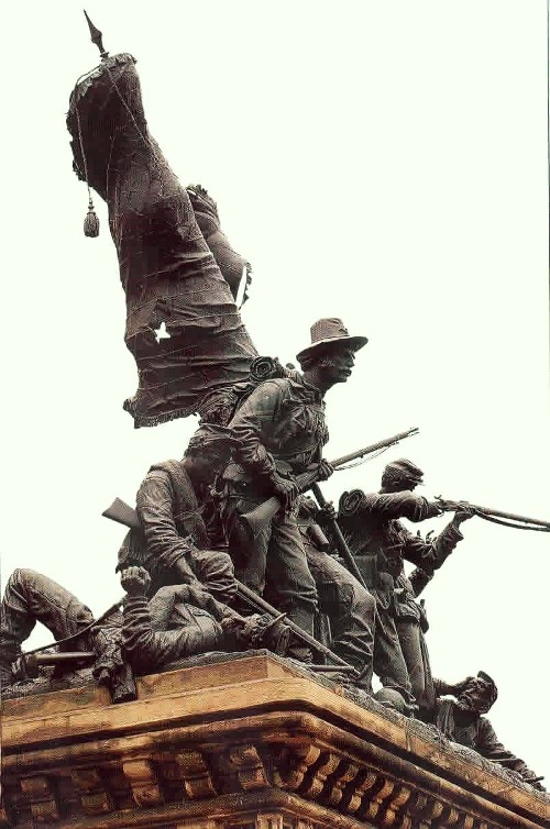 Four representative sculptures (infantry, cavalry, artillery, and naval service) adorn the four sides of the monument. The image at left, representing the infantry, is titled “The Color Guard.” The monument’s architect, former 103rd Ohio Captain Levi T. Scofield, chose to honor the 103rd’s service at Resaca.