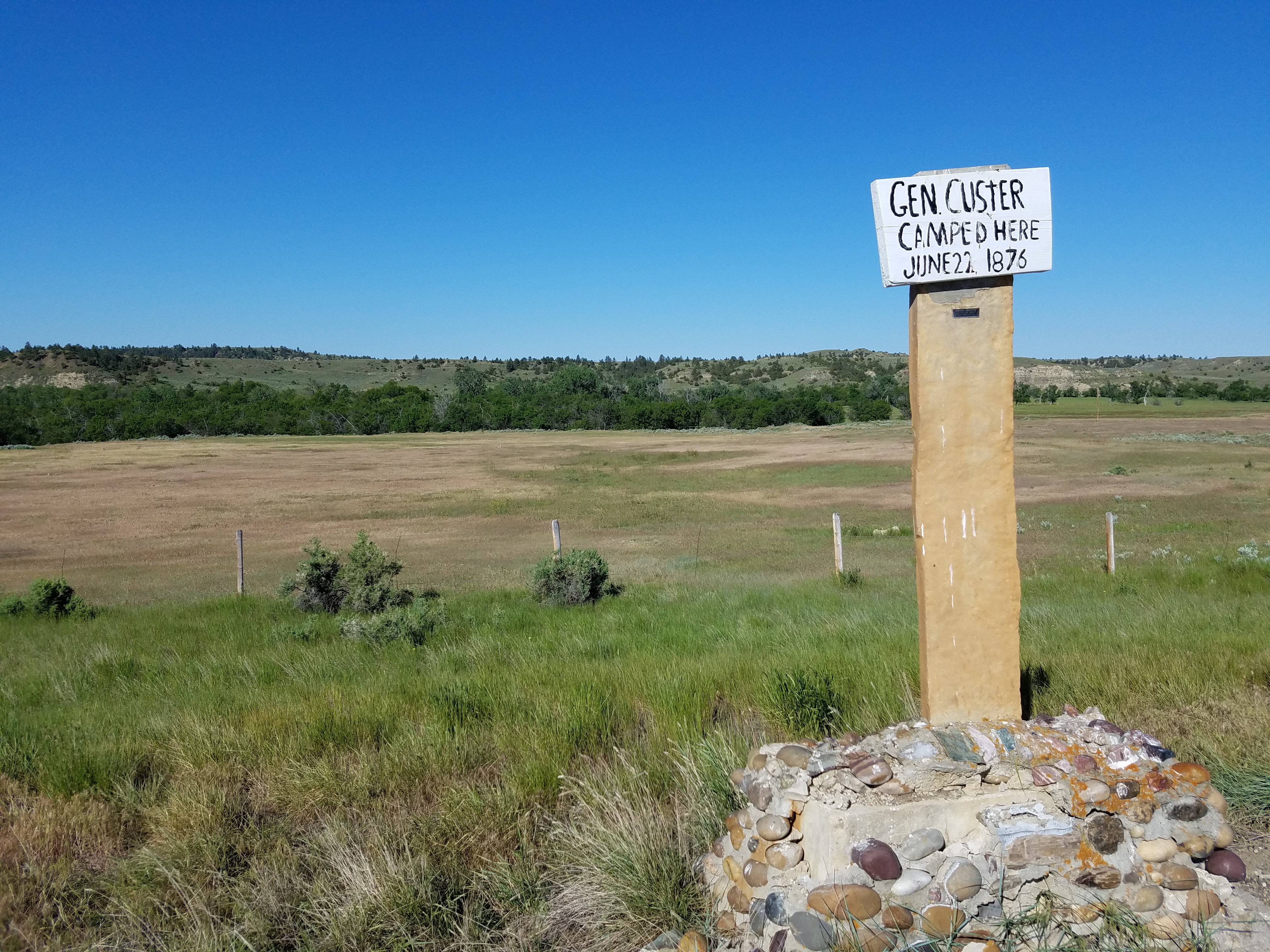 One of the things that stood out was the landscape. The terrain got rockier and the valley walls taller the farther I drove from the Yellowstone. At the marker for the Seventh’s camp of June 23, I received a bit of a surprise. The plaque on the pyramid shaped rock pile has been removed. Beginning on the twenty-third,the regiment began to encounter signs of a massive Sioux village, which continued to grow the following day. Lt. George Wallace, who would survive the coming battle only to be killed at Wounded Knee noted how so much grass from the valley floor was gone due to the grazing of the large herd of Indian ponies.