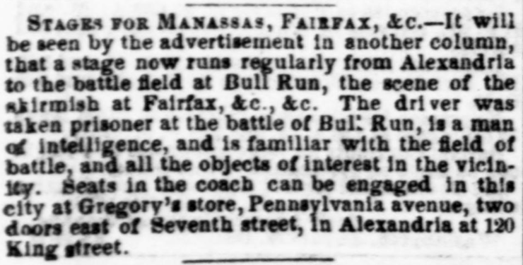 For $6, a passenger could hop on a stage coach and make their way south from Washington and visit the battlefields around Manassas. Even better, as another ad made sure to point out, the proprietor of the stagecoach line had fought at Manassas and could regale his tourists with tales straight from the battlefield: