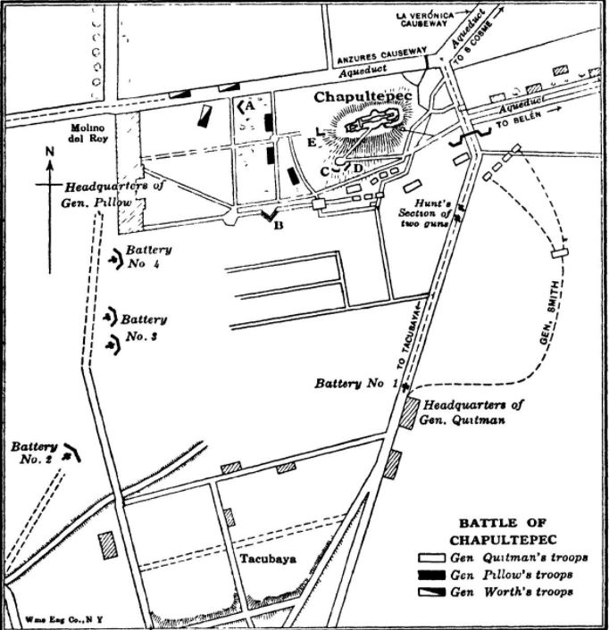 To help the artillery, Scott had Maj. Gen. John Quitman’s division demonstrate near the southern approaches to the city, hoping to trick Santa Anna into thinking they would attack there. The effort paid off, and by nightfall of September 12, Scott moved Quitman’s and Gideon Pillow’s divisions over to join William Worth’s and elements of David Twiggs’s. Scott only left a brigade of infantry near the southern causeway, allocating the majority of his army to the impending attack against Chapultepec.[6]