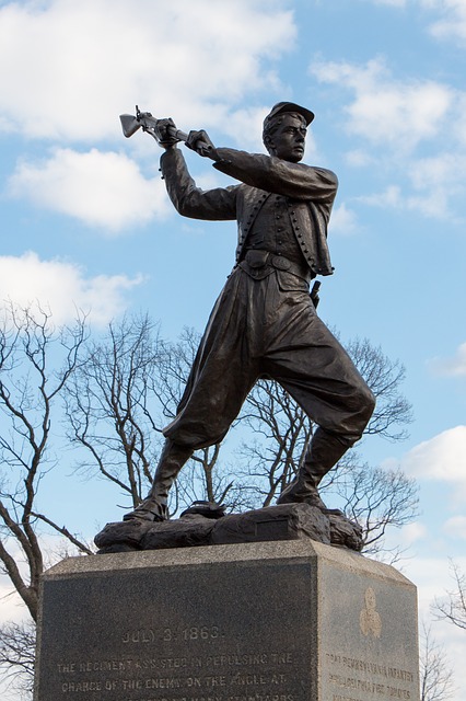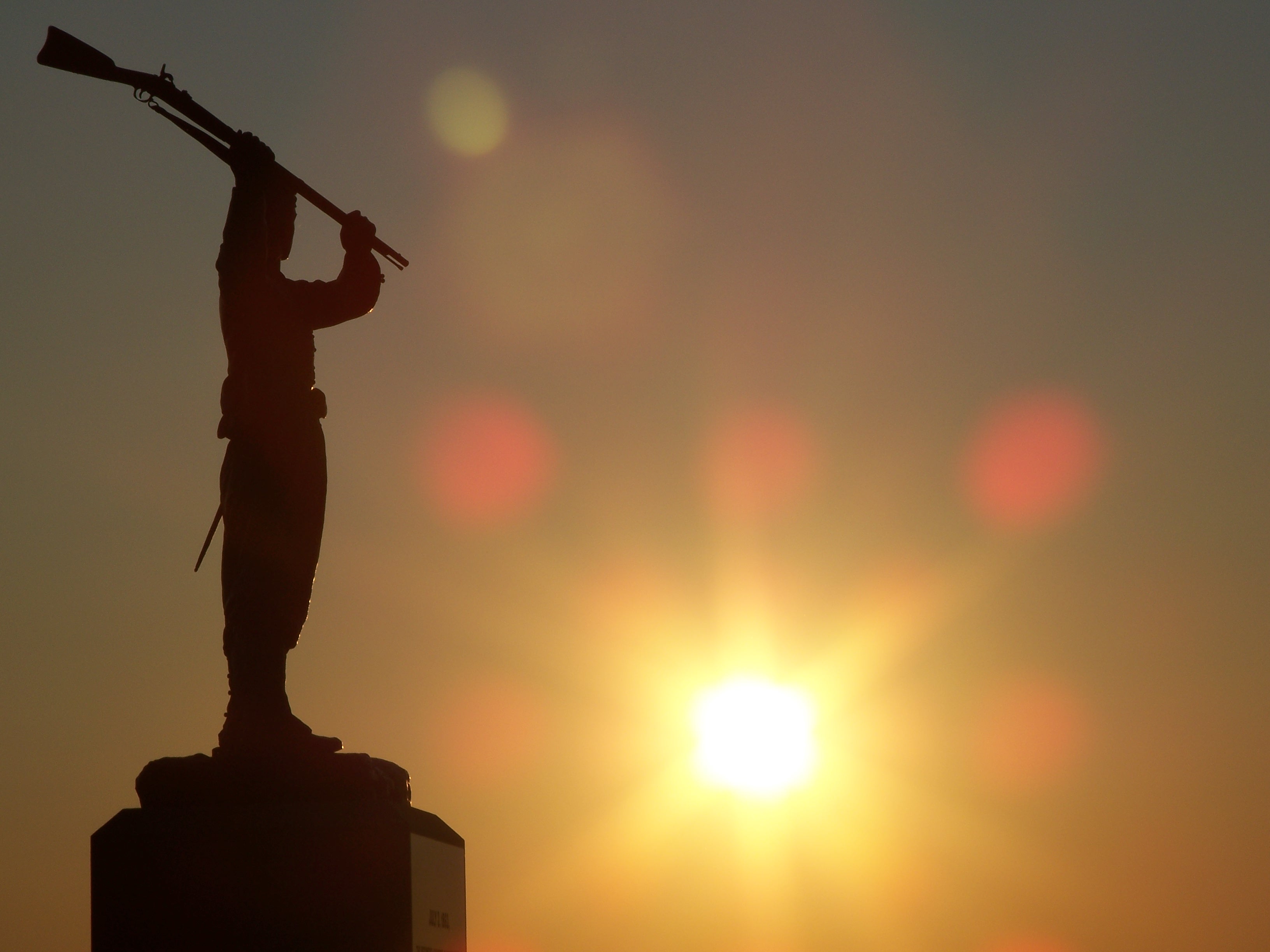 The 72nd Pennsylvania Monument at Gettysburg’s Angle features a defiant soldier in the traditional Zouave Uniform worn by the regiment. He raises his rifle in a desperately courageous pose, frozen in bronze and ever-ready to strike back at the now unseen foe.
