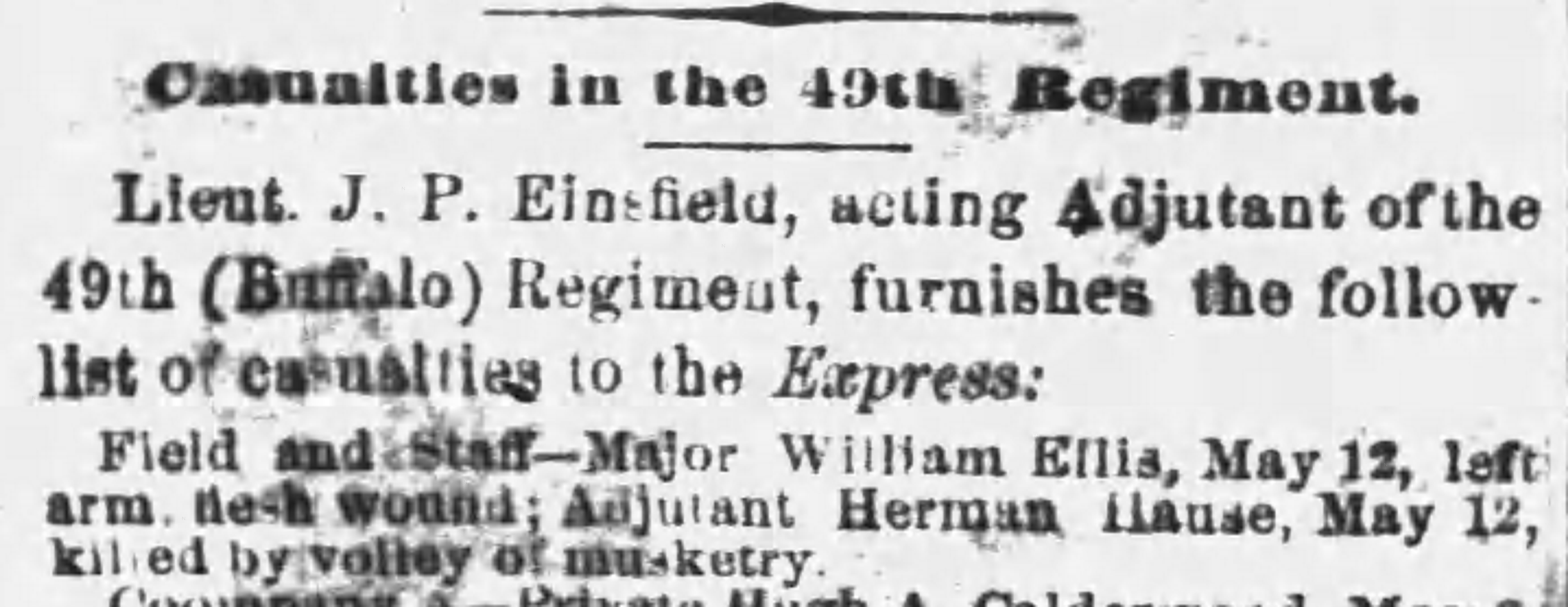 [13] “Personal,” Buffalo Daily Courier, May 27, 1864. “Home Again,” Buffalo Evening Post, May 26, 1864. Isaac A. Verplank, Statement, June 28, 1865, William Ellis Pension, Case Files of Approved Pension Applications of Widows and Other Veterans of the Army and Navy Who Served Mainly in the Civil War and the War With Spain, compiled 1861-1934, Record Group 15, National Archives.