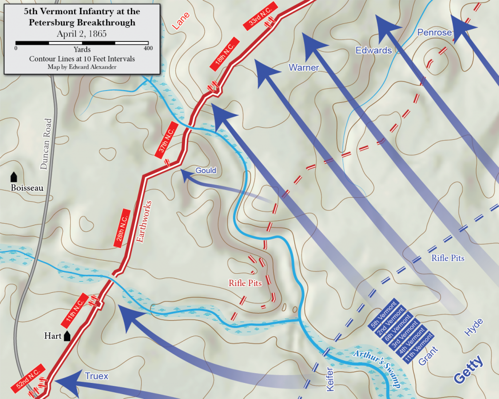 Glory could wait that morning. Bigger prizes lay ahead. By the end of the day the Vermonters had swept four miles of the Confederate line south to Hatcher’s Run and turned north to attack the artillery defending Robert E. Lee’s headquarters on Petersburg’s western outskirts. They settled in for the night around the smoldering ruins of the former Confederate headquarters at Edge Hill. “We were completely tired out,” Pratt wrote that night in his diary. There he learned of Sergeant Brownlee’s death and “went to sleep a crying.”