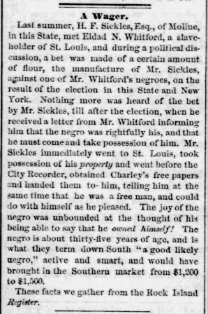 It appears that Sickles did already have anti-slavery sentiments before the war. A Chicago Tribune article from December 15, 1860 stated that he met a St. Louis slave owner while travelling for business during the summer. Their discussion eventually turned to politics, and, after disagreeing, the two placed a bet on the results of the upcoming election–Sickles wagered flour from his mill against one of Eldad N. Whitford’s slaves. Sickles won the bet but promptly freed the slave upon being summoned to St. Louis to take possession.