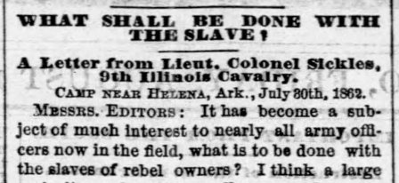 Sickles, H.F. to “Messrs. Editors,” July 30, 1862. “What Shall Be Done With the Slave? A Letter from Lieut. Col. Sickles, 9th Illinois Cavalry.” Chicago Tribune, August 15, 1862.