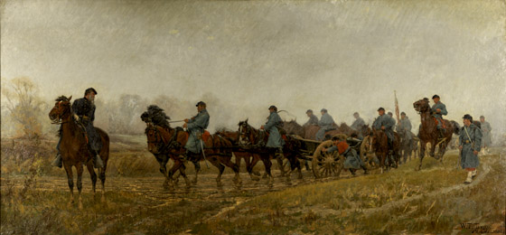 I heard male voices in the distance, shouting commands, so I looked up. A half-battery of two guns was being drawn across the field by brown horses. The men rode other horses and wore blue and red uniforms. Indeed, the guidon flags fluttered gaily in the very slight wind, identifying the individual company. I don’t remember which one it was.