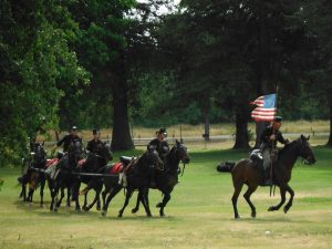 The cannons themselves were bright brass. They were reflective in the early afternoon and threw back flashes of light almost as bright as the sun overhead. Buttons, rings in the harness, the splashing water under the hooves and wheels of the caissons–all bright sparkle. And I couldn’t help but wonder just when was the last time this very field had heard those commands? When had it last cushioned the feet of artillery horses or artillery riders? When had the wind last pushed along the sounds of large guns drawn across an unnamed creek on their way to be fired in battle? Those sounds of the past, those flashes of light, the music of the leather and the wood . . . a Walt Whitman moment, certainly.