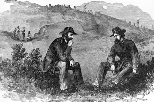Around 3:00pm along the Confederate defense works, flags of truce rose and the firing was silenced. Pemberton, Bowen, and Montgomery rode out on horseback towards a swale along the Jackson Road between the siege lines, where Grant, James McPherson, and A.J. Smith were waiting. After dismounting, the enemies shook hands and reminisced on the fond memories of their Mexican War days before discussing the heavy matter at hand.