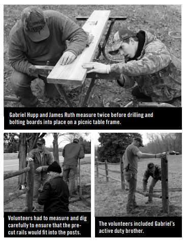 its own three-foot hole, accomplished via a handheld auger. After accomplishing this backbreaking work, Mr. Hupp constructed two wooden bench-style picnic tables and cleared the grounds of deadfall debris.