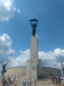 Overlooking the city from its highest point is the Liberty monument. Built in 1947 to commemorate the Soviet liberation of Budapest from German control in World War II, the monument featured a woman with a palm leaf, with Soviet soldiers at the base. Inscribed were the words: