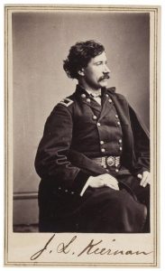 Major James Lawlor Kiernan’s swift rise from major to brigadier general in August 1863 was just as remarkable as when Elon J. Farnsworth, George A. Custer, and Wesley Merritt were famously promoted from captains to brigadier generals on the eve of the Battle of Gettysburg. Kiernan was 25 years old at the time of his promotion, only two years older than the “Boy General” George A. Custer, and equally as daring. The three cavalry officers were promoted on the recommendation of Major General Alfred Pleasonton, while Kiernan was recommended for promotion by Major General Ulysses S. Grant and twenty-five other officers. Kiernan fell as quickly as he rose; he died poor and forgotten only six years after earning his star from President Abraham Lincoln.