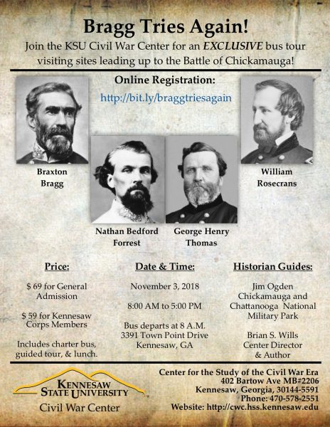 There’s essentially a week between the missed opportunity of McLemore’s Cove (September 10-11, 1863) and what became the Battle of Chickamauga (September 18-20, 1863). In this day long bus tour, we’ll look at Bragg’s second try for a battle in the West Chickamauga Creek watershed and set the stage for what did become the Battle of Chickamauga as we know it. We’ll return to Bragg’s LaFayette headquarters and then ride with the North Carolinian as he went to join Leonidas Polk for a strike on Tom Crittenden; we’ll see ground of the Rock Spring-Lee & Gordon’s Mills venture and visit the surviving post-war Lee & Gordon’s Mills where the Assistant Commissary of Subsistence will provide us with our mid-day repast catered by Oakwood Cafe, the Dalton eatery that supplied our delicious meal in April! We’ll then transition to an exploration of what became Bragg’s plan that does bring on the Battle of Chickamauga we know, in no small part thanks to the accurate intelligence gathered by the “Wizard in the Saddle” Nathan Bedford Forrest’s cavalry. We’ll visit sites like Leet’s Tanyard and Peavine Church that take us to the eve of the history book’s clash in the valley of the “River of Death.” It will be a day that further illustrates that there’s much more to the Civil War than just the big battles and that as it was lived, it might have been a very different war. Join us as BRAGG TRIES AGAIN!