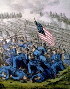 When the signal sounded the entire Corps, notwithstanding the orders to keep silent, sent up a mighty cheer and then dashed forward into the fog. As I was in the 2nd line I could not see my position very well and so moved to the right. The 2nd R.I. Vols. first struck the Rebel picket line who fired in our faces, and we went over them without firing a shot. In fact as my men had no caps on their guns we could not fire. It worked just as I had planned.