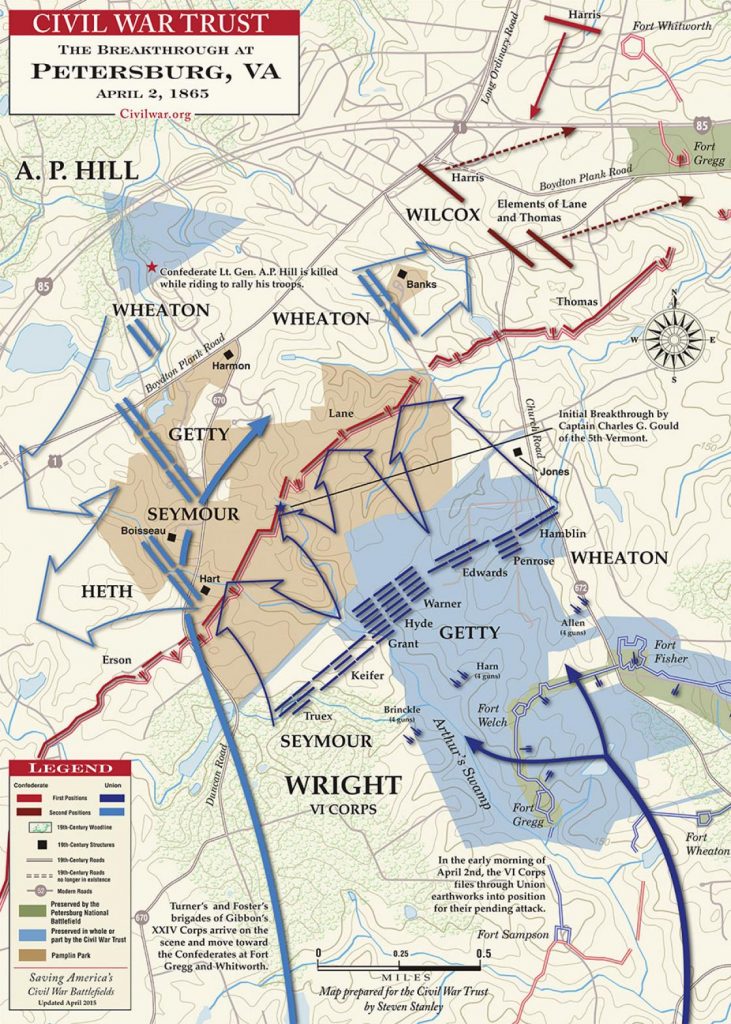 The 2nd Rhode Island Infantry Regiment formed in June 1861 and fought from First Bull Run through the Appomattox Campaign. By the opening days of April 1865, Elisha Hunt Rhodes – who had enlisted as volunteer corporal – promoted to lieutenant colonel, followed by a promotion to brevet colonel for his actions in the assault at Petersburg.