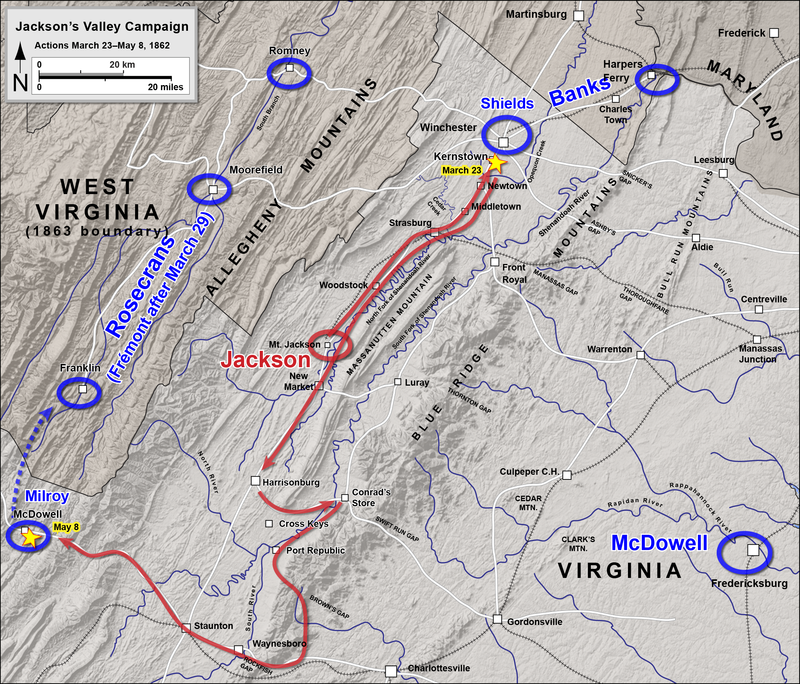 During his 1862 Valley Campaign, “Stonewall” Jackson took full advance of the gap and the railroad. In one of his mystifying tactics, he left the newly-arrived Richard Ewell and his division at Swift Run Gap (farther north) and marched his own men south to Port Republic, then east over the mountains toward Charlottesville; however, on May 4, Jackson put his men on trains and hauled him back over the Blue Ridge Mountains via Rockfish Gap. Once they arrived near Staunton, they continued west, eventually fighting the Battle of McDowell on May 8.