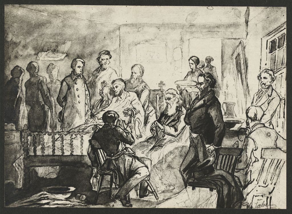 The second of Faber’s sketches depicts the medical men still attending while more cabinet members and other leaders have arrived. Note the timepiece in the seated man’s hand, probably to measuring the president’s pulse.